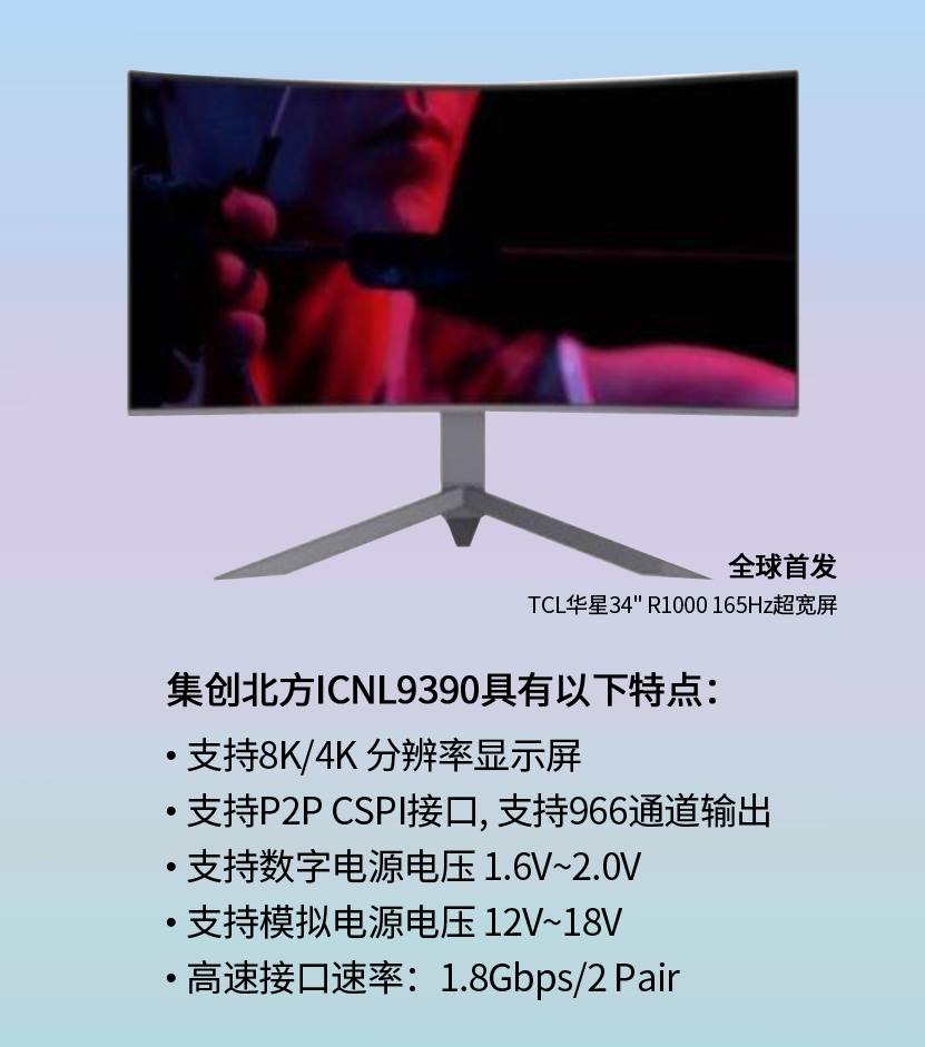 圖1:TCL華星全球首款 34”R1000 165Hz 超寬電競(jìng)屏 北京集創(chuàng)北方科技股份有限公司(簡(jiǎn)稱“集創(chuàng)北方”)自主研發(fā)的8K LCD超高清顯示驅(qū)動(dòng)芯片ICNL9390,曾斬獲SID“2019年度最佳創(chuàng)新顯示組件金獎(jiǎng)”和CUVA“優(yōu)秀創(chuàng)新產(chǎn)品與解決方案獎(jiǎng)”兩項(xiàng)行業(yè)大獎(jiǎng),其在半壓電路,抑制技術(shù)、高頻輸入接口技術(shù)、高性能輸出運(yùn)算放大器方案、低功耗設(shè)計(jì)等方面實(shí)現(xiàn)了創(chuàng)新突破。因此其在成功通過(guò)TCL華星的生產(chǎn)驗(yàn)證后,被應(yīng)用于其全球首款34”R1000 165Hz 超寬電競(jìng)屏。此款電競(jìng)屏憑借21:9 屏幕比例、3440×1440 分辨率、165Hz的高刷新率,以及R1000 產(chǎn)品曲率,成為高端電競(jìng)玩家體驗(yàn)更具震撼力和感染力的視覺(jué)沖擊,并享受流暢畫質(zhì)的硬件神器。