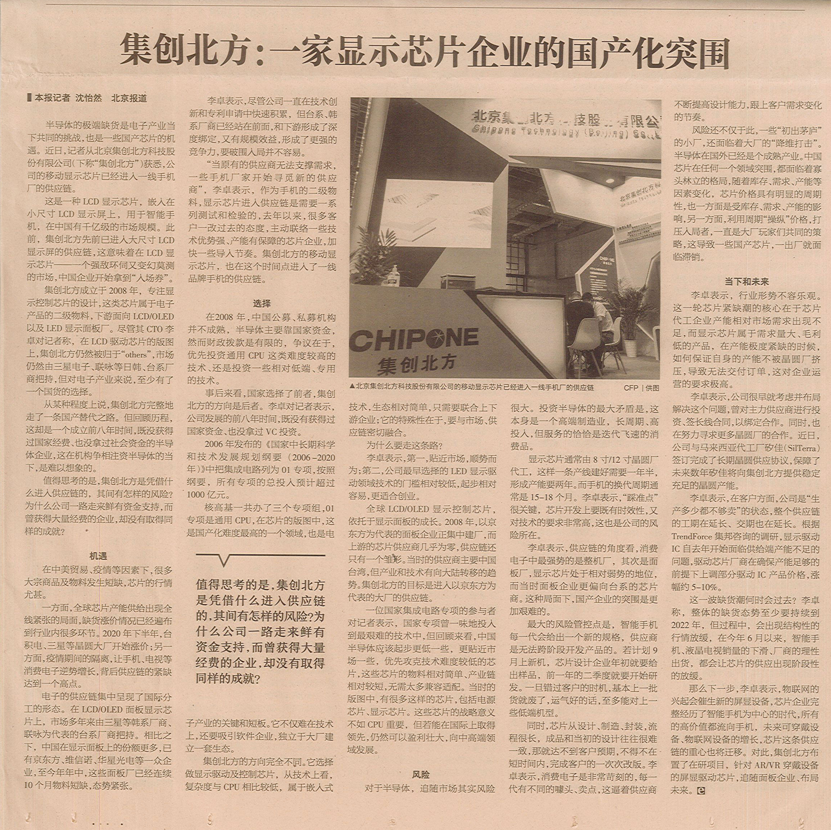 《經(jīng)濟(jì)觀察報》集創(chuàng)北方:一家顯示芯片企業(yè)的國產(chǎn)化突圍