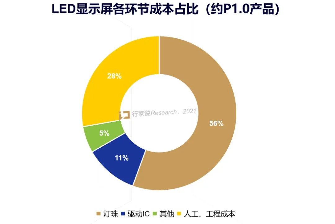 據(jù)行家說(shuō)產(chǎn)業(yè)研究中心數(shù)據(jù),一塊全彩LED顯示大屏由顯示屏箱體、顯示屏模組、電源等多個(gè)部分組成。以顯示微間距約P1.0產(chǎn)品成本為例:LED燈珠在其中所占比例大約為50%;驅(qū)動(dòng)IC所占比例約為10%;PCB所占比例大約為10%;其他部分為5%;人工/工程成本為25%。而對(duì)于P1.0以上的顯示屏產(chǎn)品,LED燈珠占比逐步下降,驅(qū)動(dòng)IC的占比則會(huì)增加。
