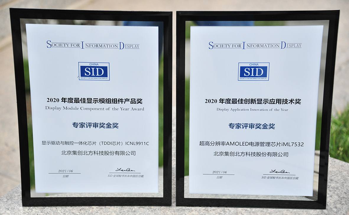 (2021年6月2日,中國北京訊)——今日,由國際信息顯示學(xué)會(SID)北京分會、臺北分會、香港分會聯(lián)合主辦,京東方和SID China共同組織承辦的2021國際顯示技術(shù)大會(ICDT2021)在北京成功落幕。在閉幕式上,中國區(qū)顯示行業(yè)獎(CDIA獎)的頒布成為最吸引眼球的環(huán)節(jié)。集創(chuàng)北方的兩款產(chǎn)品獲得評委會高度評價,喜摘金獎,其中“顯示驅(qū)動與觸控一體化芯片(TDDI芯片)ICNL9911C”榮獲年度最佳顯示模組組件產(chǎn)品獎—金獎,“超高分辨率AMOLED電源管理芯片iML7532”榮獲年度最佳創(chuàng)新顯示應(yīng)用技術(shù)獎—金獎。