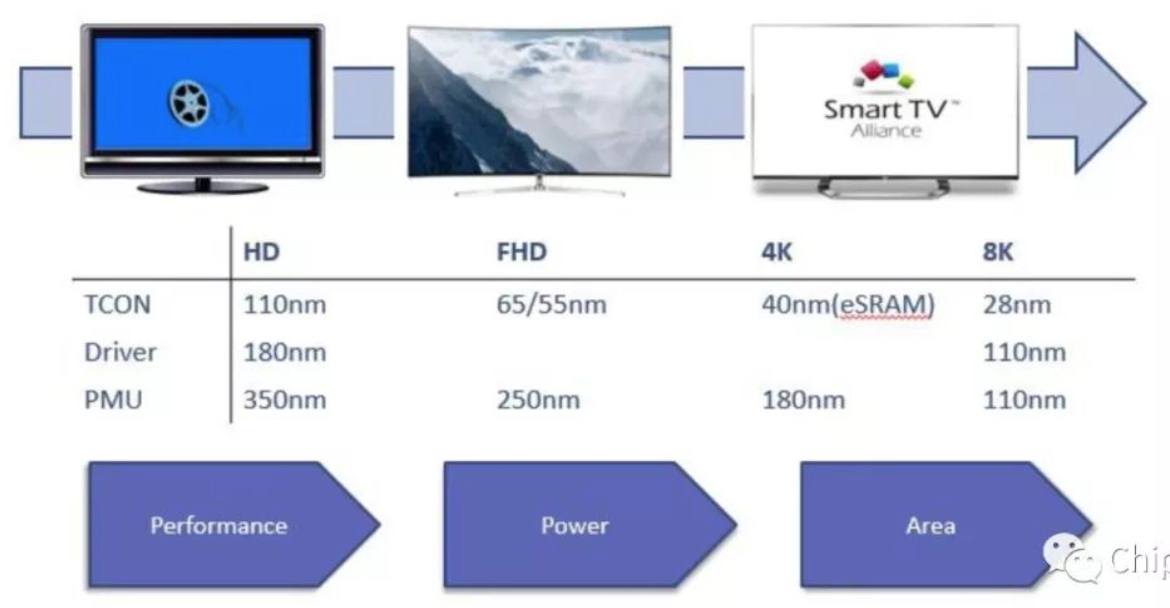 T-con芯片從110nm發(fā)展到8K的28nm,驅(qū)動IC從HD的180nm發(fā)展到8K的110nm,電源管理芯片(PMU)從0.35um發(fā)展到8K的110nm。