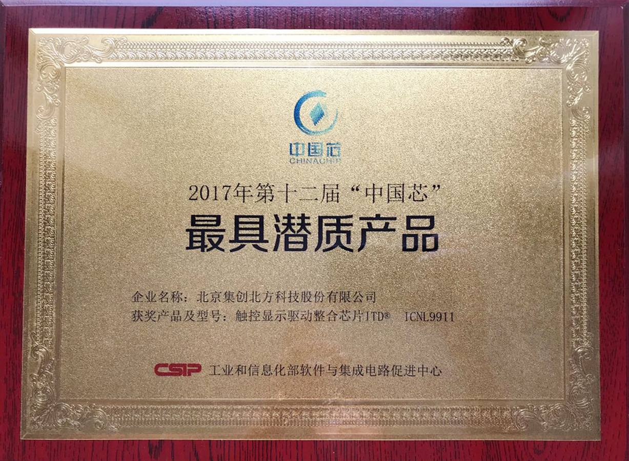 今日,工業(yè)和信息化部軟件與集成電路促進中心在昆山市舉辦第十二屆中國集成電路產業(yè)促進大會,并在會上揭曉了第十二屆“中國芯”評選結果。北京集創(chuàng)北方科技股份有限公司ITD(觸控顯示驅動整合芯片)ICNL9911榮獲——最具潛質產品獎。