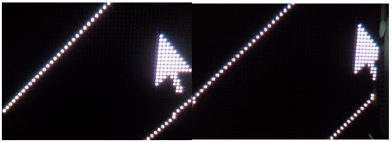 下圖為ICN2038與某友商產(chǎn)品在消鬼影方面的對比。可以發(fā)現(xiàn):單獨斜線測試時,兩款產(chǎn)品都可以消除上下鬼影。但是,在斜線上疊加鼠標(biāo)后,競爭產(chǎn)品在同一行出現(xiàn)鬼影,而ICN2038沒有。