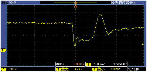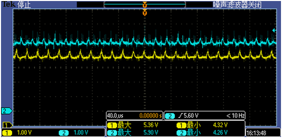 黃色波形為ICN2038,藍色波形為友商產(chǎn)品。友商產(chǎn)品開關(guān)噪聲,容易導(dǎo)致更大的電源紋波。