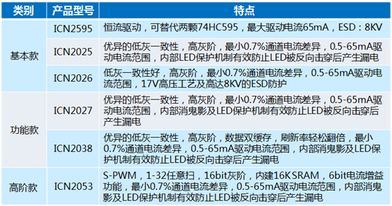 集創(chuàng)還先后推出了ICN2025、ICN2027、ICN2038、ICN2012、ICN2053等新產(chǎn)品,形成了高、中、低端全面覆蓋的LED顯示產(chǎn)品組合。其中ICN2053是小間距LED顯示屏恒流驅(qū)動器的首選,它專為1/32掃以內(nèi)掃描屏設(shè)計的內(nèi)建SPWM及16K SRAM恒流驅(qū)動器,具有高精度寬范圍電流輸出,14Bit PWM灰階控制,內(nèi)建鬼影消除電路、LED保護電路及6位電流增益功能。